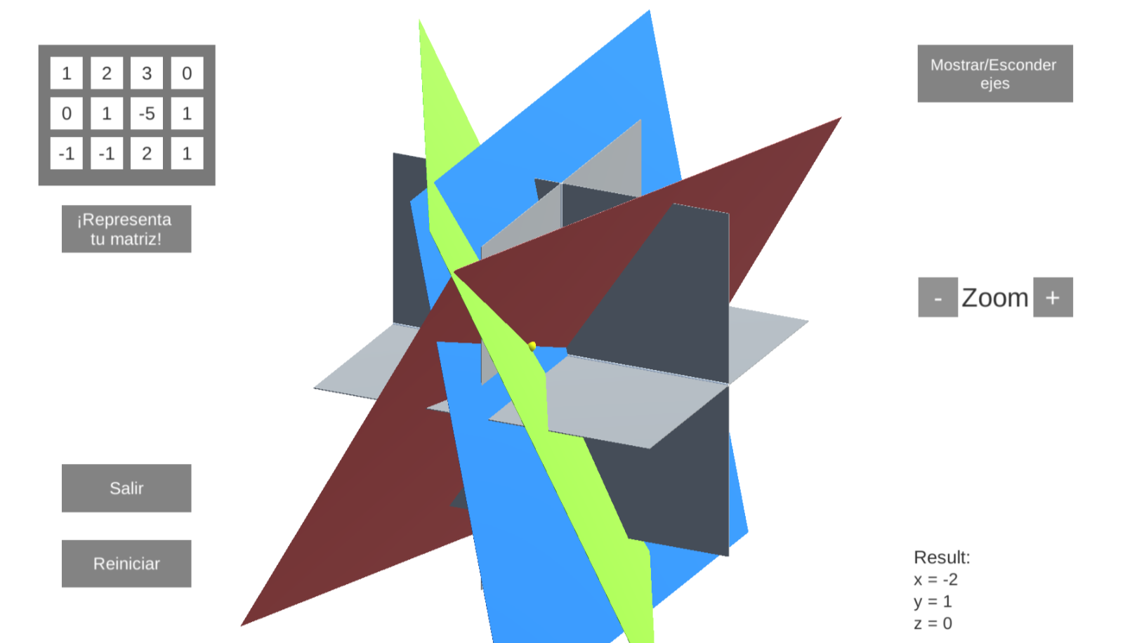 Cuando uno ve esto, se da cuenta sin mucha complejidad que este problema no va a tener siempre una solución (puesto que dos planos pueden ser paralelos o tener todos como intersección una recta en vez de un punto). Ésta es una de las principales razones por las que vi necesario programar esta aplicación web. Le permite al usuario visualizar estos conceptos y ayudarle a comprenderlos mejor.